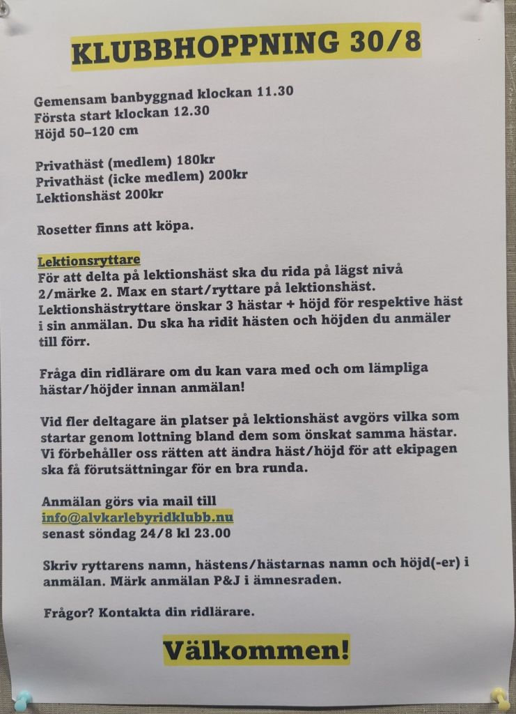 Övriga kontaktuppgifter till klubben är: Mail: info@alvkarlebyridklubb.nu Telefon: 070-200 33 03